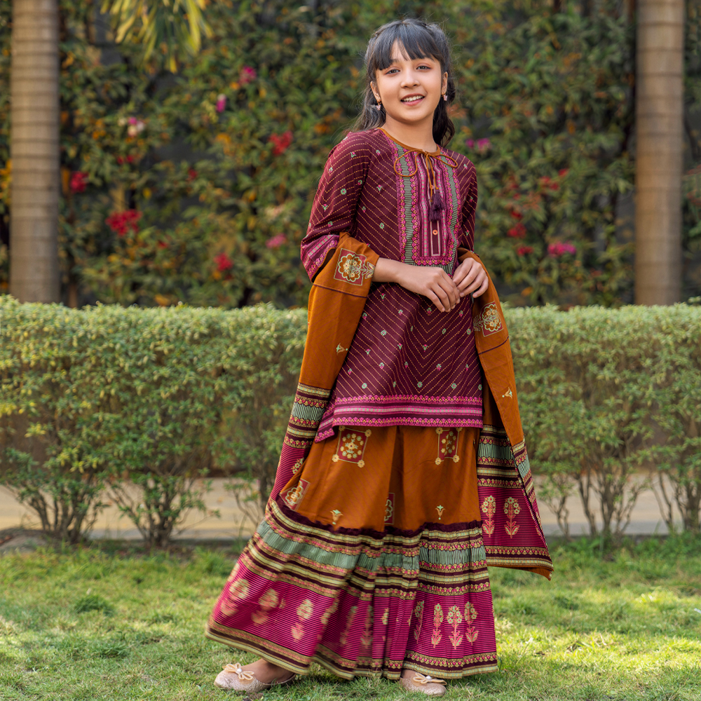 Lehenga designs for girls are often considered traditional and commonly worn at weddings and other special occasions. A fascinating composition is layered over this graceful fancy fabric ensemble rendered in a mesmerizing Brown color.