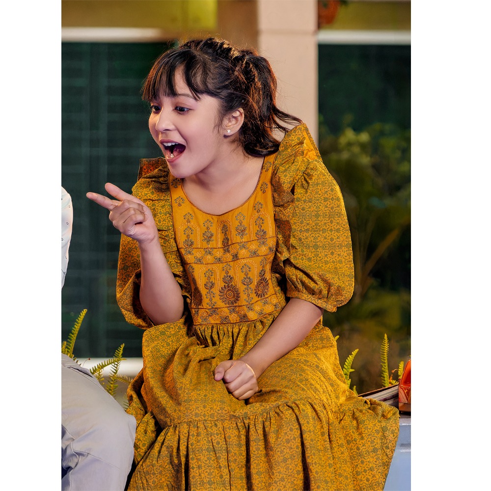 This girls Tops in a Honey Color hue has an overall printed pattern. It has a round neck with frill applique along the neckline. The front bodice of this Tops for girls has a buttoned yoke with stylish frills. The Tops is designed in gathered details for a flowy appearance. And the fabric used in this kids Tops is high-quality for breathability and durability.