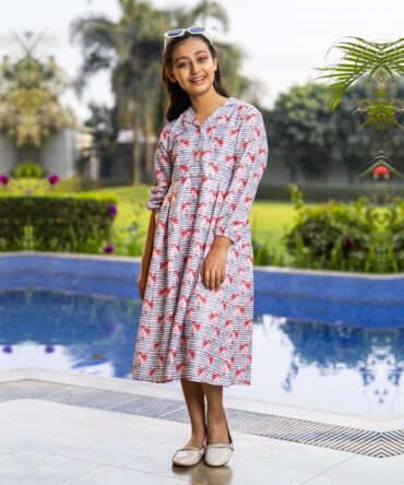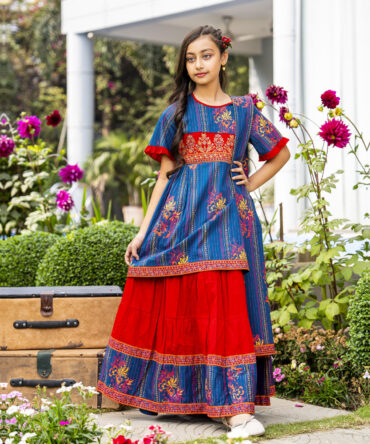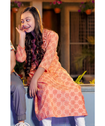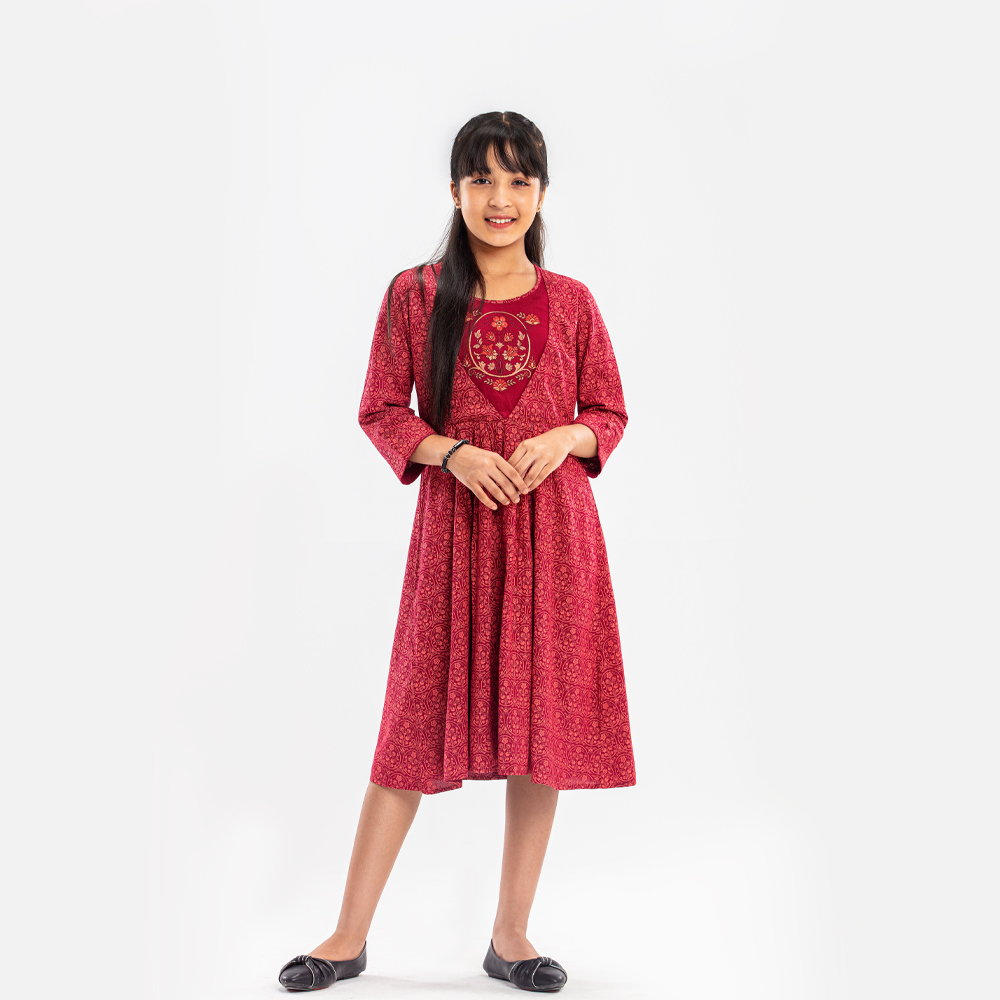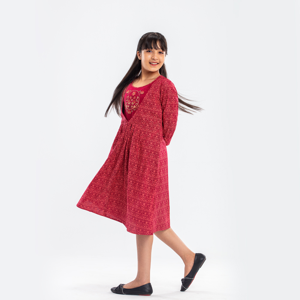 This girls Tops in a Maroon Color hue has an overall printed pattern. It has a round neck with frill applique along the neckline. The front bodice of this Tops for girls has a buttoned yoke with stylish frills. The Tops is designed in gathered details for a flowy appearance. And the fabric used in this kids Tops is high-quality for breathability and durability.