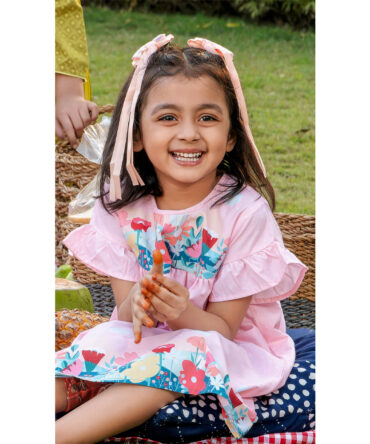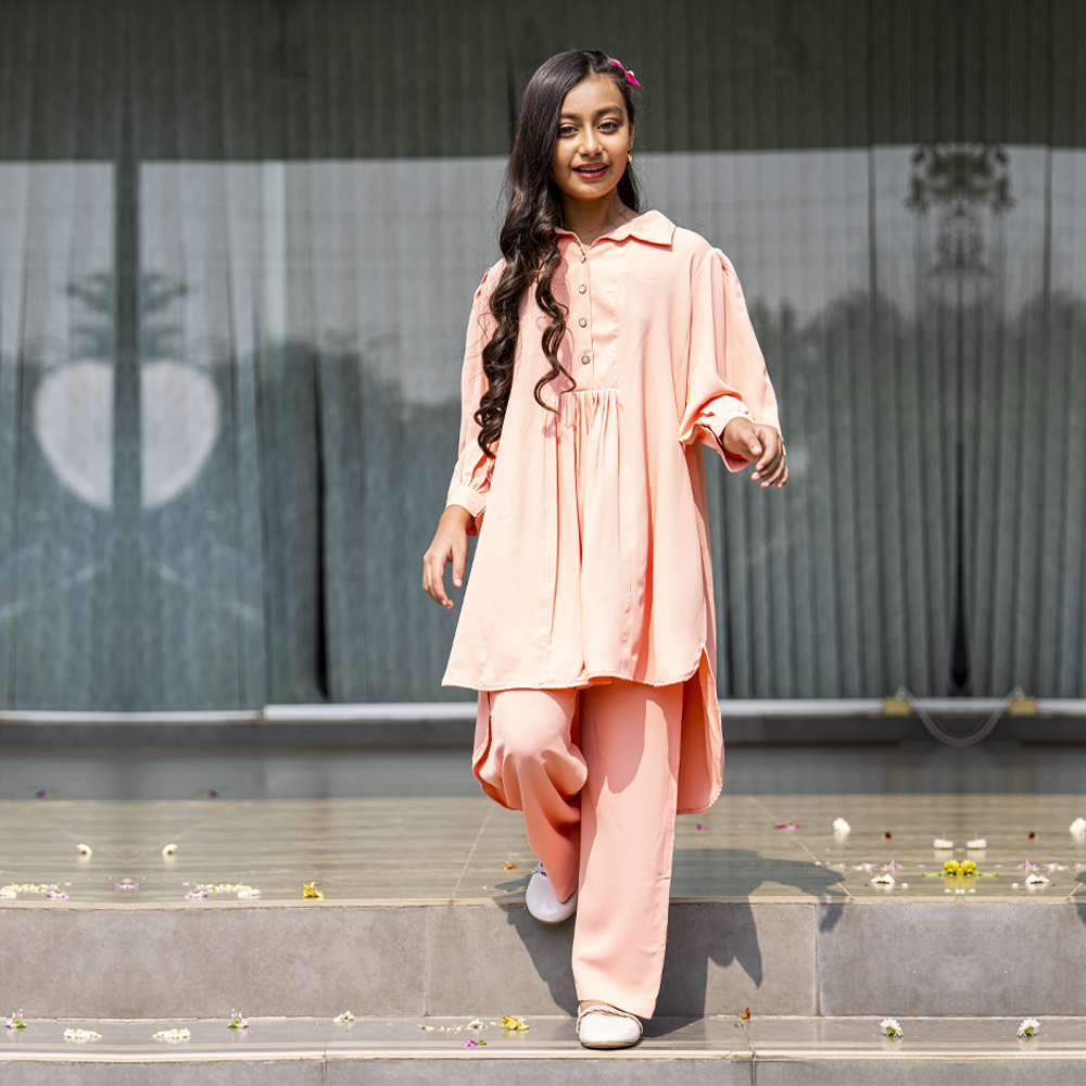 This girls Tops in a Salmon hue has an overall printed pattern. It has a round neck with frill applique along the neckline. The front bodice of this Tops for girls has a buttoned yoke with stylish frills. The Tops is designed in gathered details for a flowy appearance. And the fabric used in this kids Tops is high-quality for breathability and durability.