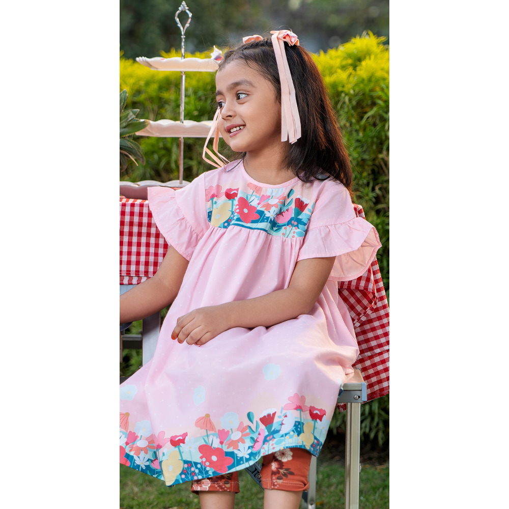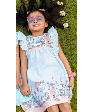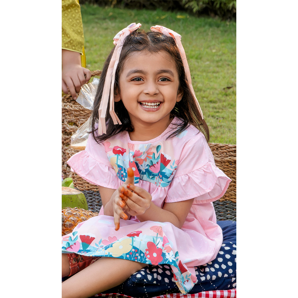 This girls frock in a pink hue has an overall printed pattern. It has a round neck with frill applique along the neckline. The front bodice of this frock for girls has a buttoned yoke with stylish frills. The frock is designed in gathered details for a flowy appearance. And the fabric used in this kids frock is high-quality for breathability and durability.