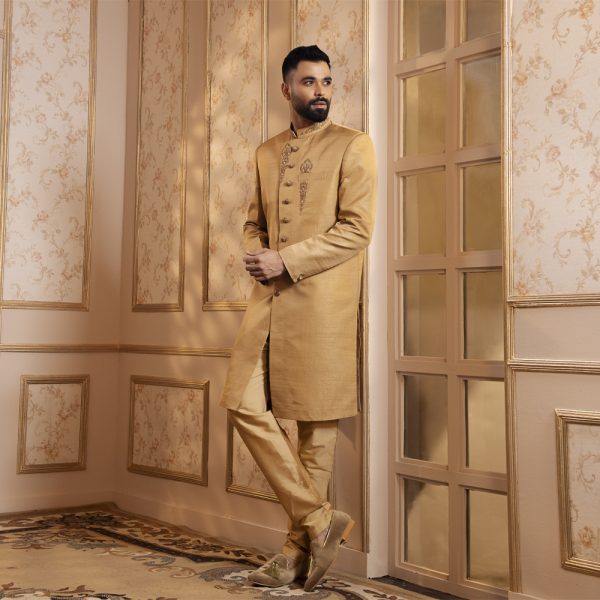 This Sherwani is a long-sleeved outer coat made for men. It is fitted, with some waist suppression; it falls to below the knees and is buttoned down the front. Mandarin collar, Quilted blended fabrics.