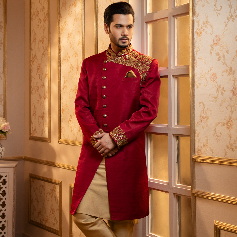 This Sherwani is a long-sleeved outer coat made for men. It is fitted, with some waist suppression; it falls to below the knees and is buttoned down the front. Mandarin collar, Quilted blended fabrics.