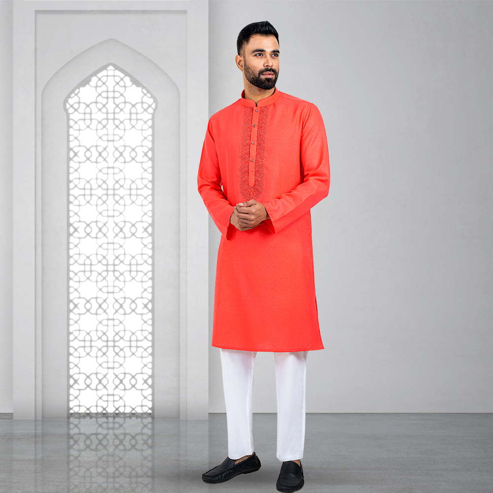 Bring a touch of tradition to your wardrobe with this Premium Panjabi. Made from 100% soft and breathable cotton, it is perfect for any occasion. The Panjabi features gorgeous designs, adding a touch of elegance to the simple yet sophisticated design. The Orange color is neutral and versatile, making it easy to style. With a comfortable Slim fit, it is both practical and stylish. Available in sizes 38 to 46, you’re sure to find the perfect size for you.